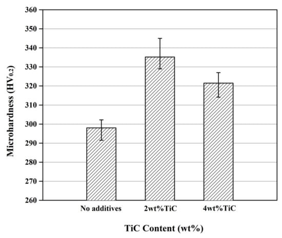 Figure 10 shows the variation in the microhardness of the TiC/316Lss metal matrix composites with different TiC ratios. This hardness value was also observed during other investigations of the SLM of 316Lss [,]. The hardness of SLMed 316Lss is comparable to that of forging parts []. The results show that with the increase of the content of TiC, the microhardness of the metal matrix composites increased significantly. Compared with pure 316Lss HV0.2 (298.3), the average microhardness of the parts formed by adding 2 wt% TiC increased by 12.4%, to 335.2 HV0.2, and to 321.5 HV0.2 after adding 4 wt% TiC. Our relevant results are consistent with those of previous studies []. The average microhardness of the parts formed by adding 4 wt% TiC increased by 7.78%. The hardness of the composites with 2% and 4% TiC was higher than that without TiC. This is because the distribution of TiC in the composites is uniform after adding 2% TiC. The distribution of TiC particles is not uniform after adding 4% TiC, as shown in Figure 8, and as the density of the composites decreases, the relative density of the different TiC contents (2%, 4%) sample was 93.2% and 92.4% respectively. In addition, TiC particles can refine cells to form fine cell strengthening. At the same time, TiC particles are dispersed to strengthen metal matrix composites. The addition of TiC particles makes the cell size decrease obviously. The refinement of cell size results in the increase of cell boundaries, and more cell boundaries hinder the movement and propagation of dislocations, thus increasing the strength, and subsequently improving the hardness of the metal matrix composites. In addition, the addition of a TiC phase with a higher hardness value tends to increase the hardness of the composites similarly [,]. The strengthening mechanism of the metal matrix composites formed by SLM mainly included TiC particle strengthening and Ti element solution strengthening. Meanwhile, the mechanical properties of formed parts are also affected by density and structural defects. Since the heating and cooling speed of the SLM process is very fast, the microstructure of the reinforced structure is obviously refined, and the hardness value is maximized. There are two key factors for cell refinement by adding TiC particles. Firstly, the TiC in the molten pool plays the role of the nucleation centre in the solidifying process, promoting the formation of the equiaxed austenite cells through hindering []. Another point is that the TiC has a much higher thermal conductivity (70 W/MK) than the 316Lss matrix (15 W M‒1 K‒1), which promotes the thermal transmission during the fast melting–solidification process. This process significantly increases the cooling and solidification rates, and further decreases the thermal residual stress.