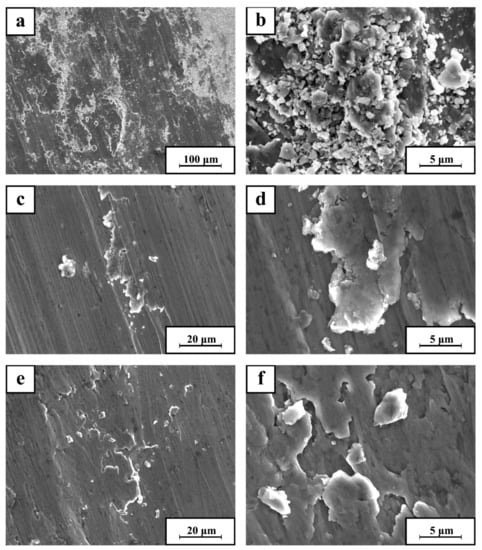 SEM images showing the typical worn morphologies of TiC/316Lcomposites with different volume contents; (a,b) 0 wt% TiC, (c,d) 2 wt% TiC, and (e,f) 4 wt% TiC.