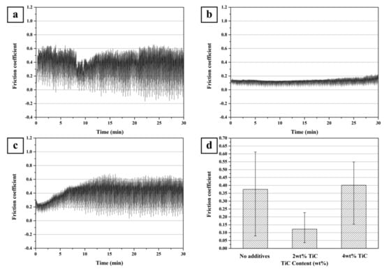 Coefficients of friction of the samples formed by SLM: (a) Pure 316L sample and the samples of the TiC/316Lss composites with different TiC contents: (b) 2 wt% TiC, (c) 4 wt% TiC, and (d) average friction coefficient.