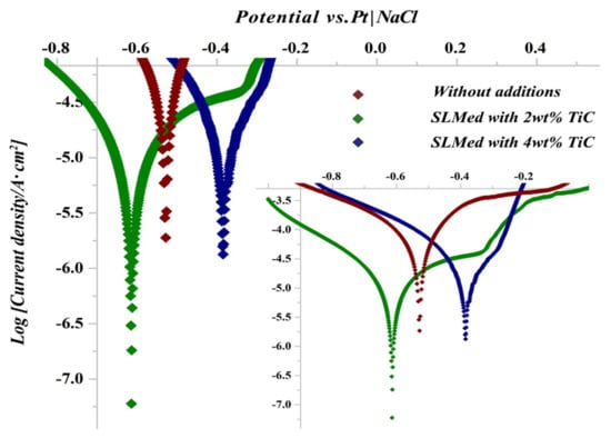 Potentiodynamic curves for the TiC/316L composites formed by SLM with different TiC contents of in 3.5% NaCl solution.