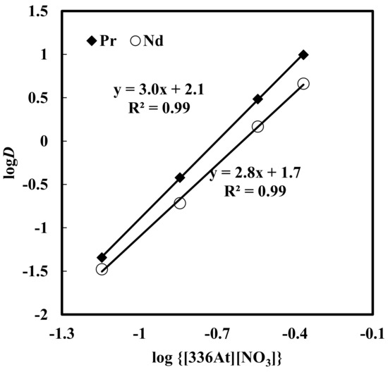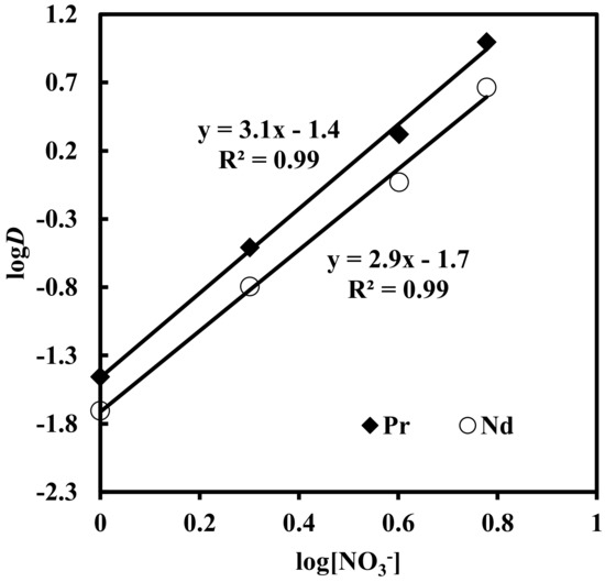 Solvent extraction of rare earth elements under varying concentrations (1–6 M) of NaNO3 in solutions containing 0.012 M Nd, 0.003 M Pr, 0.0002 M Dy, and 0.0001 M EDTA, with 0.43 M [336At][NO3], was studied. The results depicted in Figure 5 show that the extraction of Pr, Nd and Dy increased with an increase in nitrate concentration in the aqueous phase. When nitrate concentration increased from 1 to 6 M, rare earth extraction increased from 3% to 90% for Pr, 1.9% to 82% for Nd and 0.8% to 39% for Dy. The plot of logD vs. log[NO3−] for Pr and Nd (Figure 6) had slopes of 3.1 and 2.9, respectively. This indicates the involvement of 3 moles of nitrate ions for the extraction of one mole of metal ion into the organic phase. The overall reaction mechanism can be represented as