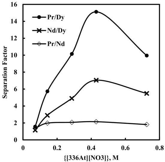 Here, solvent extraction of rare earth elements, from a 6 M NaNO3 solution containing 0.012 M Nd, 0.003 M Pr, 0.0002 M Dy, and 0.0001 M EDTA with varying concentrations of [336At][NO3] (in the range of 0.07–0.73 M) at constant aqueous feed pH of 3, was studied. Beyond 0.73 M [336At][NO3] concentration, the organic phase was found to be comparatively viscous and phase separation was difficult. The results are depicted in Figure 2 and Figure 3. It was found that extraction of Nd, Pr and Dy increased with an increase in [336At][NO3] concentration, and 90% Pr, 82% Nd and 39% Dy were extracted with 0.43 M [336At][NO3] (Figure 2). The extraction of Pr and Nd was found to be >95% along with 80% extraction of Dy by using 0.73 M [336At][NO3]. The plot of logD vs. log[336At][NO3] for Pr and Nd (Figure 3) had slopes of 3 and 2.8, respectively, with a correlation coefficient of 0.99, indicating association of 3 moles of the extractant for the extraction of 1 mole of metal ions into the organic phase (Equation 10). Separation factors between different pairs of rare earth elements (Pr/Dy, Nd/Dy and Pr/Nd) at varying concentrations of [336At][NO3] were calculated and are shown in Figure 4. It was found that the separation factors for each pair of rare earth elements increased with an increase in [336At][NO3] concentration up to 0.43 M. At 0.43 M [336At][NO3], the separation factor values were 15.1 for Pr/Dy, 7 for Nd/Dy and 2.1 for Pr/Nd.