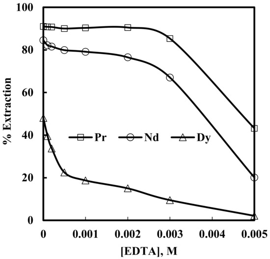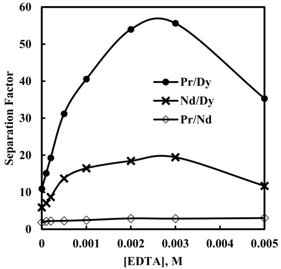 The plot of separation factor values against EDTA concentrations is shown in Figure 9. It is interesting to observe that separation factor values for Pr/Dy and Nd/Dy increased with an increase in EDTA concentration up to 0.003 M EDTA. Conversely, when EDTA was not used in the aqueous solution, the separation factor values for Pr/Dy, Nd/Dy and Pr/Nd were found to be 10.9, 5.9 and 1.8, respectively. However, when 0.003 M EDTA was used as the complexing agent, separation factor values increased to 55.6, 19.4 and 2.9, respectively (Table 4). Beyond 0.003 M EDTA the separation factor values decreased continuously. The stability constants (log βEDTA) of Pr, Nd and Dy ions with EDTA are 16.17, 16.48 and 18.01, respectively [44]. Dysprosium forms a stable complex with EDTA, in comparison with Pr and Nd. Therefore, in the present investigation, EDTA preferentially masked Dy ions present in the aqueous solution and increased the separation values for Pr/Dy and Nd/Dy up to 0.003 M EDTA. Beyond 0.003 M EDTA, Pr and Nd were also effectively masked by EDTA, thereby decreasing the separation factor values. At 0.003 M EDTA, separation factor values obtained for Pr/Dy and Nd/Dy were 55.6 and 19.4, respectively. The separation factor for Pr/Nd (2.9) was almost constant, as shown in Figure 9, due to a very small difference in their stability constant with EDTA. Comparisons of separation factor values for Pr/Nd obtained in the present investigation with the values reported in the literature are given in Table 5. It is clear from Table 5 that the use of EDTA as a complexing agent improved the separation factor for Pr/Nd.