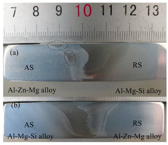 Cross sectional photos of the joints: (a) AS: Al-Zn-Mg and (b) AS: Al-Mg-Si, reproduced from [38], with permission from Elsevier, 2016.