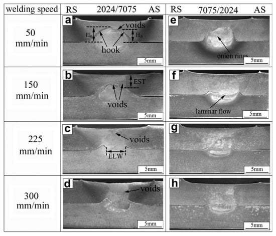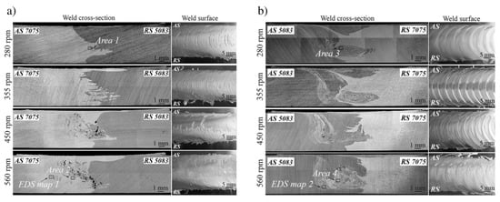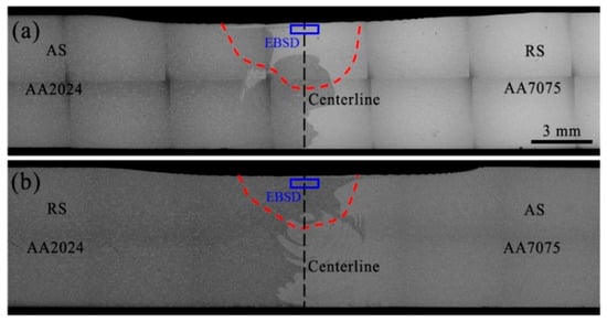 Cross-sectional SEM macrostructure of the AA2024-AA77075 joints: (a) AS: AA2024 and (b) AS: AA7075, reproduced from [71], with permission from Elsevier, 2019.