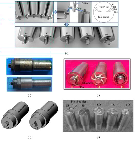 Tools of different geometries used in different Al alloy combinations. (a) AA2024-AA7075, reproduced from [14], with permission from Springer, 2018; (b) AA5083-AA7075, reproduced from [16], with permission from Springer, 2018; (c) AA5083-AA6351, reproduced from [18], with permission from SAGE, 2018; (d) AA5083-AA6082 [34], with permission from the authors; (e) AA5083-AA6351 [57], with permission from Springer, 2013.