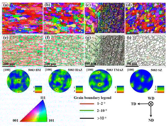 The typical microstructure of a FSW joint consists of three distinct zones that is, HAZ, TMAZ and SZ [87,88]. These zones form depending on the thermal and mechanical deformation that the tool induces during welding. The SZ undergoes extensive grain refinement, producing fine grain microstructures, while the TMAZ has an elongated grain structure [89,90]. The microstructure evolution depends on the welding parameters (as discussed in the previous section), as the material movement or flow plays a more important role in the case of dissimilar material combinations compared to same material joints. The appropriate selection of all process parameters results in excellent material mixing on the both sides (AS and RS) of the joint and produces a sound weld. Recently, a comprehensive EBSD investigation for the AA5083-AA2024 joint was reported by Niu et al. [91], as shown in Figure 9. As it can be seen from the EBSD orientation maps (Figure 9a–d), tilted and elongated grains in the TMAZ and fine grains d in the SZ developed due to dynamic recrystallization. Grain boundary orientations also varied in all three zones as shown in Figure 9(e–h). A higher fraction of large (>10°) angular grain boundaries was present in the SZ, while more of low (2–10°) angular grain boundaries were present in HAZ. Also, a more intense texture in the SZ was formed compared to other zones.