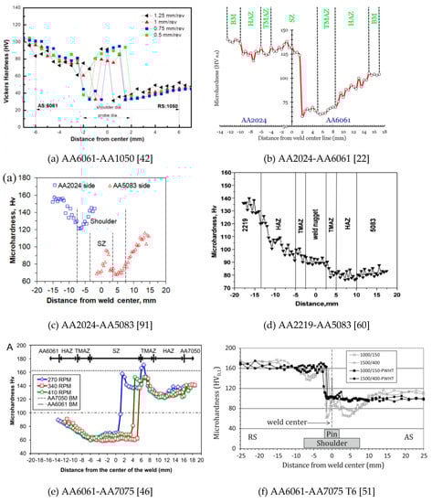 Hardness distribution along the cross section of the dissimilar Al combination joints. (a) AA6061-AA1050 [42]; with permission from the authors. (b) AA2024-AA6061, reproduced from [22], with permission from Elsevier, 2108; (c) AA2024-AA5083 reproduced from [91], with permission from Elsevier, 2019; (d) AA2219-AA5083 reproduced from [60], with permission from Elsevier, 2012; (e) AA6061-AA7075 reproduced from [46], with permission from Elsevier, 2015; (f) AA6061-AA7075 T6], reproduced from [51], with permission from Springer, 2014.