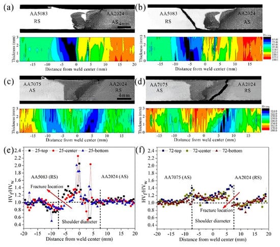 Cross-sectional macrostructures and hardness distributions of the FSWed dissimilar joints: (a) 25-joint before fracture, (b) 25-joint after fracture, (c) 72-joint before fracture, (d) 72-joint after fracture; hardening level across the FSWed joints: (e) 25-joint and (f) 72-joint, reproduced from [13], with permission from Elsevier, 2018. Note: 25-joint means AA2024-AA5083 and 72-joint means AA7075-AA2024 joint.
