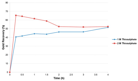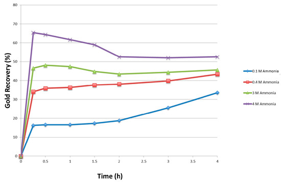 Figure 2 shows the influence of NH3 concentration on gold recovery, while Figure 3 shows the influence of S2O32− concentration. In both cases, CuSO4 concentration was constant at 0.1 M [11,14,22]: the thermodynamic condition that allows the best gold recovery was achieved with a solution of the following composition: 2 M S2O32−, 0.1 M CuSO4 and 4 M NH3.