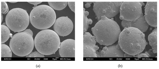 For the experiment, the substrate used was AISI D2 bulk steel, and AISI M4 (supplied by Carpenter Co., Philadelphia, PA, USA) and HWS (supplied by Rovalma S.A., Barcelona, Spain) powders were used as the depositing materials. The substrate was machined to dimensions of 50 mm × 100 mm × 10 mm. As shown in Figure 1, the powders of M4 and HWS comprise spherical particles with diameters in the range of 50–150 μm. The powders are manufactured using a gas atomizer. Table 1 lists the chemical compositions of each material. The M4 material has a high carbon content and high W, Mo, Cr, and V contents. On the other hand, HWS has a higher Cr content than M4.
