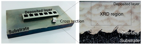 To observe the microstructure of the deposited layer, electrolytic polishing was performed using Lectropol-5 (Struers Corp., Cleveland, UT, USA) for each of the deposited samples. Electrolytic polishing was carried out with the following values: Voltage: 35 V, time: 25 s, and flow rate: 9 L/min using electrolyte (A3 solution, perchloric acid: butoxyethanol: methanol, ratio of 1:6:4) at a current of 0.80 A.