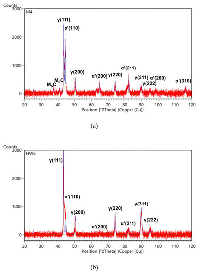 The hardness of each can be explained in relation to the microstructure. The microstructure obtained using laser melting exhibits a fine carbide morphology and a solidification matrix structure, compared to that fabricated using casting or sintering. Therefore, although the carbon content of the HWS powders is relatively lower than that of the D2 material, uniform and fine carbides are precipitated in the deposits, and the matrix is made of martensite and fine carbides. Thus, the HWS deposits exhibit higher hardness. With respect to the difference in the hardness values between M4 and HWS, both microstructures formed using laser melting were found to be similar. However, the constituents of the carbides differed, and the martensite content in the matrix was higher in the M4 deposited specimen. The high hardness of the HT-HWS is attributed to the increased martensite fraction and fine carbides in the matrix caused by quenching.