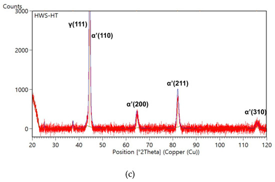 To confirm the phase, carbides, and crystal structure formed in the deposited layers, XRD analysis was performed such that the cross section (5 mm × 5 mm) of only the deposited layer was irradiated with x-ray (Figure 4). Figure 5a–c shows the X-ray diffraction patterns of M4, HWS, and HT-HWS, respectively. The results show different XRD patterns depending on the chemical compositions and post-deposition heat treatment, with gamma (γ, austenite, ICDD number 03-065-9094) and alpha prime peaks (α’, martensite, ICDD number 03-065-4899) observed in common. The M4 spectrum is characterized by gamma, alpha prime, and M6C peaks (Figure 5a). The quantitative analysis results show that the gamma content is 22%, and the alpha prime is 78%. Thus, the matrix structure in M4 was identified as austenite and martensite, and M6C carbides shown at 38° and 40° were identified from another study [5]. Nevertheless, MC carbide and M23C carbide precipitate in M4; however, they could not be identified in the XRD analysis in this study. In the HWS spectrum, only gamma and alpha prime are patterned (Figure 5b). The martensite and austenite structures are formed by melting and rapid cooling. The fraction of carbide observed in the microstructure is expected to be lower. The gamma and alpha prime contents are 61% and 39%, respectively. HWS contains a higher austenite fraction than M4, in accordance with their chemical compositions: HWS has both a lower C (i.e., austenite-stabilizing element) content and higher Si and Cr (ferrite-stabilizing) contents than M4. The HT-HWS exhibits a phase transformation in the microstructure, and the XRD pattern is different from the HWS because of the post-heat treatment, which reduced the austenite fraction and increased the martensite fraction in the matrix (Figure 5c). When quenched from an austenite state to room temperature with rapid cooling, there is not enough time for the carbon to diffuse. As a result, carbon remains in the solid solution state in α iron, and the retained austenite in the deposited layer is transformed to martensite by quenching.