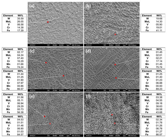Elemental composition analysis (based on microstructure observation) and EDS were conducted for the metallurgical characterization in conjunction with the XRD analysis. Regarding the microstructures of the deposited M4, HWS, and HT-HWS, two regions of interest were observed: The deposited layer, including the coating and the dilution zones (Figure 6a,c,e), and the interface region (Figure 6b,d,f). As in previous studies [10,11,12], the cellular dendrites were observed in the deposited layer (Figure 6a) and columnar dendrites at the interface (Figure 6b) of the M4 deposited specimen—the respective microstructures that depend on the cooling rate of the melting pool. The EDS results show that the carbides at the interface and in the deposited layer came from the precipitation-related tungsten-molybdenum-chromium-rich MC series. In the M4 tool steel, MC, M6C, and M23C6 reportedly precipitated [13]. Notably, these carbides include vanadium-rich MC carbides, molybdenum-rich M6C carbides, and chromium-rich M23C6 carbides.