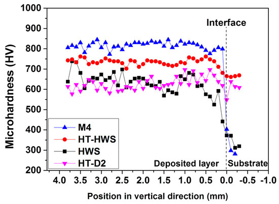 Each deposited layer was found to exhibit different microstructures because of the differences in the chemical composition and post-heat treatment. As the different microstructures affect the mechanical properties, the hardness of each was measured and compared with that of a widely used heat-treated D2 material (HT-D2) [15]. Figure 7 shows the micro-hardness variation from the deposited layer to the substrate in the vertical direction for M4, HWS, and HT-HWS. HT-D2 shows a uniform hardness value of 625 HV. However, the hardness values of HWS, HT-HWS, and M4 differ depending on the location (deposited layer or interface). The hardness decreases in the interface, where the depositing powders and the substrate were melted and mixed together in the melting pool. In other words, the hardness decreases with the increase in the substrate content. The deposited HWS layer has an average hardness of 644 HV, whereas those of HT-HWS and M4 are 737 HV and 818 HV, respectively. The hardness values of M4, HWS, and HT-HWS are higher than that of HT-D2.