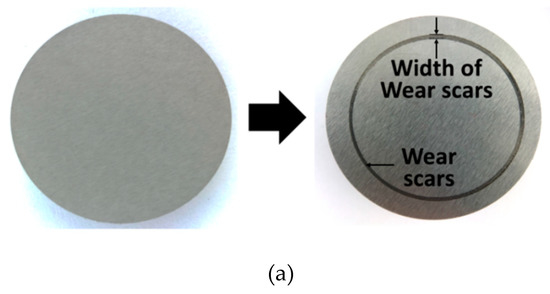 The wear specimens were prepared with a 1.0-mm-thick layer deposited onto a cylindrical substrate, as shown in Figure 3a. A ball-on-disk wear tester (R&B Inc., Daejeon, Korea) was used, and the cemented carbide ball (Ø12.7 mm) was set to be rotated on the top surface of the specimen for 10 min under a load of 147.1 N (15 kgf) and at a ball speed of 100 rpm.