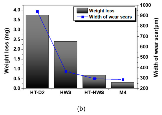 To compare the wear characteristics, all the specimens were tested under the same conditions. When two surfaces are brought into contact, the junctions to be sheared might break through at the weakest plane or loci of points within an interface of the bodies once a critical force is reached. Thus, plastic deformation and weight loss occurred on the surface after conducting the wear test. If the wear resistance is weak, the surface in contact with the ball widens, the worn width increases, and the weight loss increases. Figure 8 shows the weight loss and wear scars before and after conducting the wear test. The significant weight loss and width of the scars correspond to a low wear resistance in the test. The HT-D2 tool steel shows a weight loss of 3.7 mg (standard deviation (SD): 0.021) and a width of 940 μm after the wear test. HWS exhibited a weight loss of 2.4 mg (SD: 0.567) and a width of 365 μm, whereas the values of HT-HWS are 0.67 mg (SD: 0.208) and 296 μm, respectively. M4 shows the highest wear resistance (0.3 mg (SD:0.008), 287 μm). The general criterion for wear resistance is usually related to the hardness of the material. In this experimental result, the wear resistance and hardness tend to be proportional. The result shows that a material wear decrease can be achieved by increasing the martensite volume fraction and its hardness [16]. To identify the wear behavior by sliding, it is necessary to observe the wear trace.