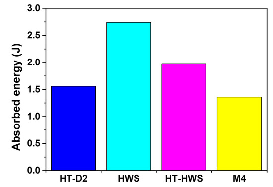 The Charpy test was performed to evaluate the toughness of the deposited materials. Figure 10 shows the experimental results wherein the toughness values are compared. The Charpy test results show the opposite tendency with respect to the hardness and wear resistance. The total absorption energies of the HT-D2, HWS, HT-HWS, and M4-deposited specimens are 1.56 (SD: 0.01), 2.74 (SD: 0.01), 1.96 (SD: 0.352), and 1.36 (SD: 0.346) J, respectively. The hardness and wear resistance of the M4 deposits are higher than those of the HWS deposits, whereas the impact toughness of HWS is higher than those of HT-D2 and M4. Furthermore, the impact toughness of HT-HWS slightly decreases after the post-heat treatment.