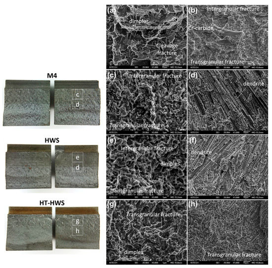 Figure 11 shows each of the fractured surfaces. In general, the impact toughness is highly related with the grain boundary and carbides’ precipitation behavior. On the fracture surface of the D2 (substrate), cleavage fractures and fine dimples are observed (Figure 11a). Cleavage fractures are mainly observed in ferrite structures, and dimples represent a ductile fracture. A ductile fracture corresponds to a high absorbed energy. The HT-D2 surface exhibits the intergranular and transgranular fractures with fewer fine dimples (Figure 11b). The HT-D2 toughness was lower because the microstructure is transformed to martensite from ferrite by the heat treatment. In the deposited M4 layer (Figure 11c), intergranular and transgranular fractures were observed without dimples and plastic deformation, which shows the typical brittle characteristic. The cracks originating from the V-notch propagated along the grain boundaries and along the dendrite structure at the interface (Figure 11c,d). Figure 11e shows the fracture surface of the HWS-deposited specimen. The fracture behavior is characteristic of a complex intergranular fracture with dimples. Dendrites were observed at the interface of HWS (Figure 11f). Compared to the M4 deposits, fine dimples were observed in the HWS fracture surface because of the microstructure depending on the chemical composition. The highest toughness of HWS is also attributed to the austenitic matrix. The fracture surface of HT-HWS exhibited different crack propagation characteristics. Although the fracture surface of the deposited layer of HT-HWS is similar to that of the HWS deposited layer (Figure 11g), the martensite fraction in the HT-HWS increased and, in the interface region, the primary rod-like carbides precipitated along grain boundaries by the quenching and tempering, which decreases the toughness. In particular, the eutectic carbide aggregated during the post-heat treatment resulted in a concentration of the stresses, causing cracks to propagate more readily between the grain boundaries. Thus, the absorbed energy was reduced compared to that in HWS, while being higher than that of M4.