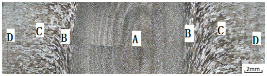 Metallograph of the aluminum alloy FSW joints: (A) WNZ, (B) TMAZ, (C) HAZ, (D) BM.