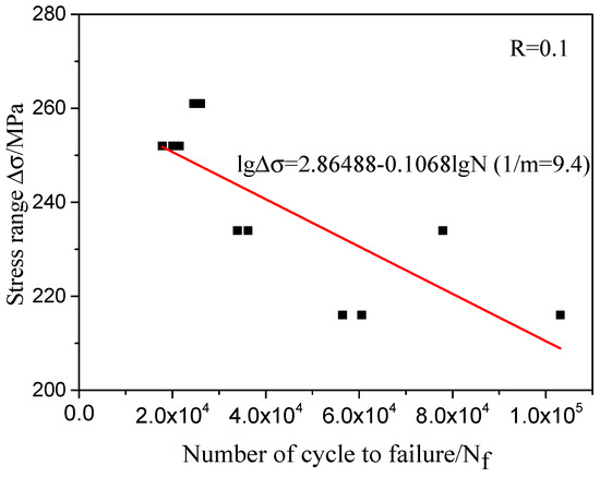 All fatigue tests were carried out using MTS858 hydraulic servo system (MTS Systems Corporation, Minneapolis, MN, USA) under the axial stress range from 216 to 261 MPa with a stress ratio of 0.1 and a frequency of 10 Hz until the specimens fractured. The fatigue loading parameters and total fatigue lives are available from Ref. [25]. The curve of cyclic stress range versus fatigue lives for the FSW specimens is shown in Figure 3.