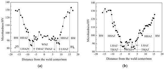 Hardness distributions of (a) upper and (b) lower surfaces in the joint.