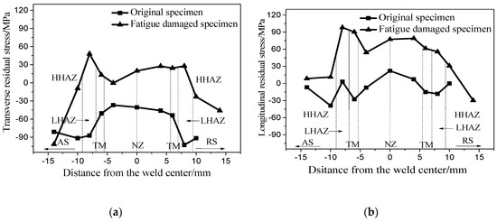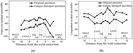 The residual stress distributions are shown in Figure 5 and Figure 6. The transverse residual stresses are the stresses perpendicular to the weld and the longitudinal residual stresses are the stresses parallel to the weld direction. The center of the WNZ was taken as the zero coordinate and the test points were selected on both sides along the axial direction of the specimen. The measured residual stresses before fatigue test are called as the original residual stresses of the specimen in this paper. The residual stresses of the fatigue-damaged specimens were measured after the fatigue cycle reached 30,000 cycles under the cyclic stress range of 216 MPa with a stress ratio of 0.1.