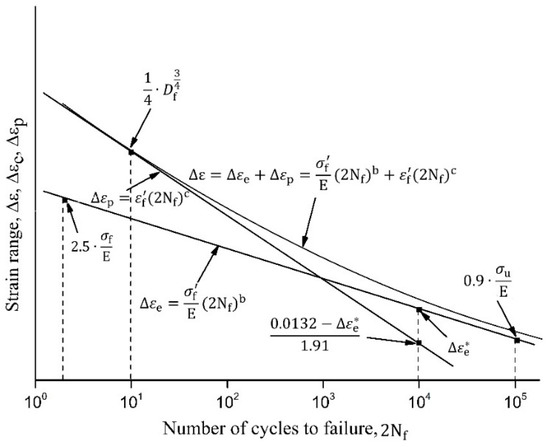 The four-point correlation method is based on the elastic and plastic strain-life lines. The respective two points on elastic and plastic lines are definite. On the elastic line, a point is at 1/4 cycle with a strain range of 2.5 /E, where σf is the fracture strength, E is the elastic modulus. The other point is at 105 cycles with a strain range of 0.9 σu/E, where σu is the ultimate tensile strength. On the plastic line, a point locates at 10 cycles with a strain range of 1/4D3/4, where D is the logarithmic ductility of the material. Another point is at 104 cycles with a strain range of , indicates the value of elastic strain range at 104 cycles on the elastic line, as shown in Figure 7.