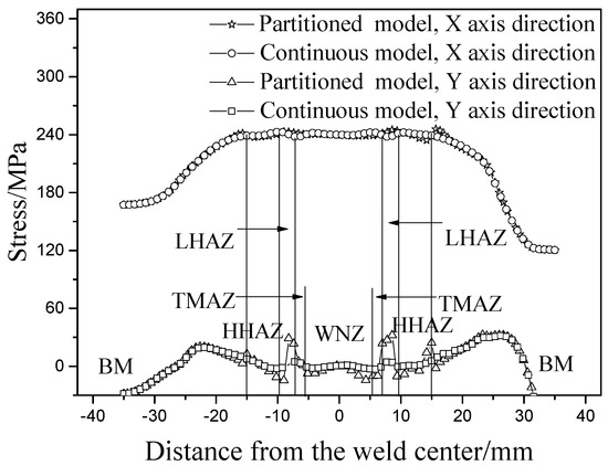 The stress components of continuous and partitioned joint models were analyzed. There is no stress in the Z direction. The shear stresses are so small that their effects on the fatigue performance of the welded joint are ignored. It can be considered that the stresses in the X and the Y directions determine the total stress distribution of the FSW joints. The stresses in the X and the Y directions of upper surface in the models were extracted for analysis as an example, as shown in Figure 13. The stresses in the X direction are larger in the two models since the tension-tension stress is loaded in the X direction. The stress fluctuation appeared in the X and the Y directions of the partitioned performance joint model. The stress distribution of the continuous performance joint model has no obvious sudden change.