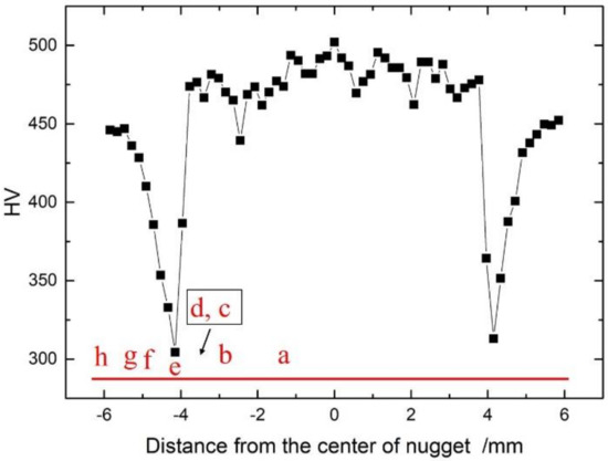 3.3. Micro-Hardness Distribution Across a Spot Welded Joint