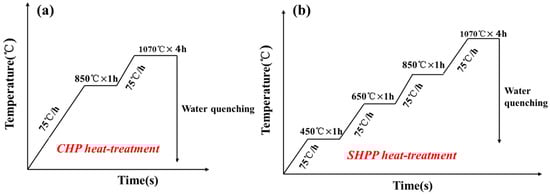 Heat-treatment curve of continuous heating process (CHP) (a) and segmented heat preservation process (SHPP) (b) of steel.