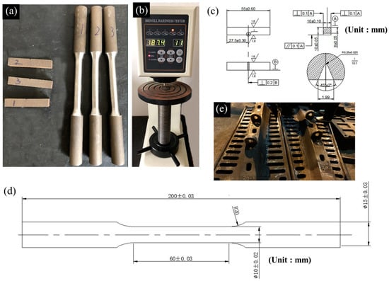 (a) Physical picture of tensile specimen and impact toughness test specimen. (b) Schematic diagram of hardness experiment. Drawing of impact specimen (c) and tensile specimen (d). (e) The physical picture of casting mill liners.