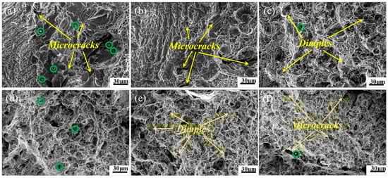 The room-temperature tensile specimen fracture morphologies of CHP and SHPP steels are shown in Figure 6. Both steel fracture morphologies were typical ductile fracture models. A great amount of microcracks existed in the CHP steel fracture (marked by red arrows); at the same time, there were many micron-scale particles (marked by purple circles) near the microcracks, which is shown in Figure 6a,b. Figure 6c shows the large and shallow dimples of the CHP steel fractograph (marked by blue arrows). Compared with the CHP steel fracture morphology, SHPP steel had more small and deep dimples at the fracture; meanwhile, the dimples were more evenly distributed, which is shown in Figure 6e. Figure 6d shows the precipitate particles of the SHPP steel fracture, with the smaller particles being distributed in deep and small dimples. The number of microcracks in the SHPP steel fracture was lower than in the CHP steel fracture, as shown in Figure 6f. During the tensile process, when the stress on the specimens exceeds the precipitation particle deformation resistance, microcracks would occur in the steel. As the loading process progresses, the microcracks would be elongated or deformed, resulting in specimen fracture. The larger size precipitates in steel tend to become stress concentration points, which will reduce the grain boundary strength when distributed at the grain boundary, leading to the generation of microcracks more easily [,]. The coarse precipitates of the CHP steel deteriorated the toughness of the steel; during the tensile process, a number of microcracks rapidly formed around the coarse particles, which accelerated the fracture of the specimen, resulting in a decrease in tensile strength and elongation of CHP steel. The results showed that the precipitates in SHPP steel were smaller; therefore, the use of Ti-V-Nb alloying with SHPP heat-treatment could enhance the yield strength and maintain an excellent toughness and elongation.