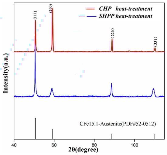 Figure 7 shows the X-ray diffraction (XRD) pattern of CHP and SHPP steels. From the XRD results, only the diffraction peaks of austenite were found in the steels with two heat-treatment processes, but there were no diffraction peaks of martensite and precipitates. This was due to the high content of Mn and C in the steel to stabilize the austenite phase region [,], and the precipitates accounted only for a small part of the volume fraction in both steels. Additionally, it was also found that the diffraction peak intensities of both steels was different. This may be related to the preferred grain orientation and texture of both steels after solid-solution treatment processes, resulting in a change in the number of crystal faces involved in diffraction, so the diffraction peak intensities of both steels changed. This will be further discussed later in combination with the EBSD experimental results.