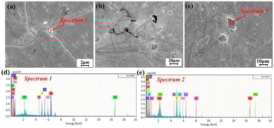 Scanning electron microscope (SEM) microstructure (a–c) of cast high-manganese steel and energy spectrum analysis (d,e) of precipitates in cast high-manganese steel.