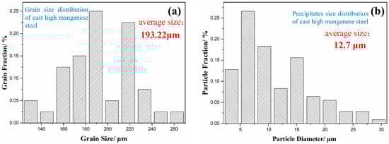 Figure 9a shows the size distribution of austenite grain in cast high-manganese steel: a grain size in the range of 180–220 μm was the most frequent and the average grain size was 193.22 μm. Figure 9b shows the size distribution of precipitates in cast high-manganese steel. The largest amount of precipitates was distributed within the size range of 5–15 μm and the average grain size of precipitates was 12.7 μm.