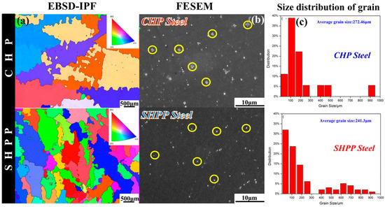 Grain size analysis of CHP and SHPP steel by orientation decomposition image map (a); FESEM micrographs of distribution and quantity of precipitates in both steels (b); size distribution of austenite grain in both steels (c).