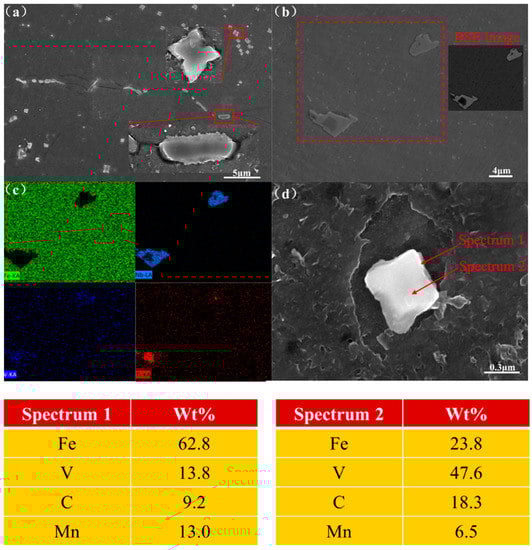 It is shown in Figure 11d that some small square-shaped precipitates were present in the CHP steel. These small-sized precipitates were confirmed to be VC according to energy spectrum analysis (as shown in Figure 11 (bottom)), which will be discussed later.