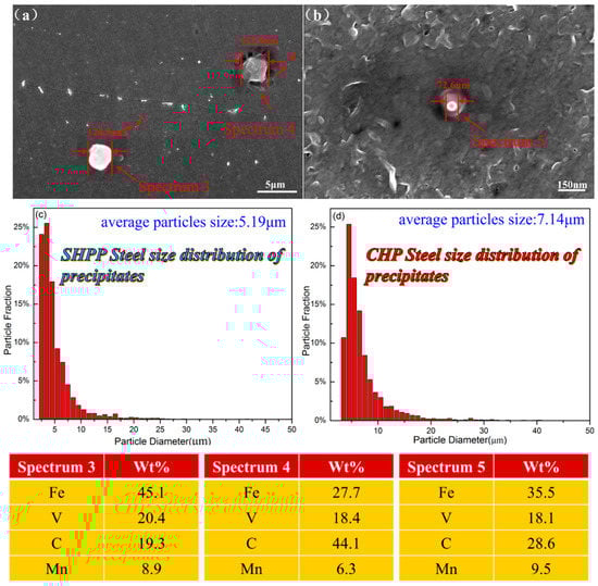 Figure 12a shows the precipitates in SHPP steel, which were relatively uniform in distribution and smaller in size compared to the CHP steel. Due to the discontinuous distribution of the precipitates at the grain boundaries, the toughness was significantly better than that of the CHP steel. Figure 12b shows the morphology of the precipitates in SHPP steel below 100 nm, and their shape is spherical. According to energy spectrum analysis, these submicron-scale precipitates (marked by red arrows) of the SHPP steel were VC, as shown in Figure 12 (bottom). Figure 12c shows the size distribution of the precipitates in SHPP steel. Figure 12d shows the size distribution of the precipitates in CHP steel; at the same time, the average size of the precipitated particles were 5.19 μm and 7.14 μm. It was found that the number of precipitates below 2.5 μm in the SHPP steel was obviously higher than in CHP steel, and the CHP steel contained more precipitates above 5 μm. Due to the precipitation temperature range of the VC being relatively low [], when the SHPP steel was isothermal at 450 and 650 °C, a part of VC precipitated. The SHPP steel had a higher degree of supercooling because of the lower isothermal temperature, which increased the phase transformation driving force of VC precipitates, and the VC was randomly precipitated in austenite grain []. Meanwhile, due to the slow diffusion of alloying elements, the VC precipitates would not show coarsening []. Because the CHP steel had no isothermal processes at 450 °C and 650 °C, V precipitated together with Ti and Nb in isothermal processes at 850 °C and 1070 °C []. Therefore, a part of VC was wrapped on the precipitates of TiC and NbC, reducing the volume fraction of the single VC precipitated particles.