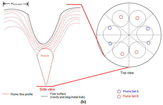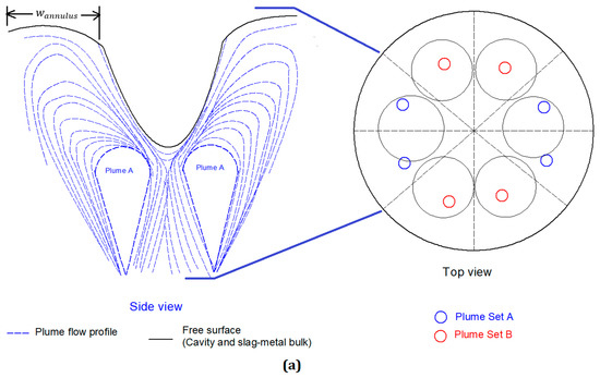 In ladles, single plumes are used to increase the mass transfer between slag and metal [51,52,53]. Contrary to a single gas-metal plume in a ladle, the emergence of bottom stirring plumes on a free surface is more complex. Based on locations of the bottom stirring plugs the plume may emerge to different locations on a free surface. In this study, the bottom stirred plug configuration is applied based on the data reported by Bertezzolo et al. [54] for the 200-t oxygen steelmaking furnace. The top view of this interaction between 8-bottom stirring plumes and a 6-holed lance for a 200-t oxygen steelmaking furnace is shown in Figure 2a,b. It should be noted that the intention of this figure is a schematic diagram to represent the assumption related to the plume-cavity interaction. The fluid flow profile is not computed by the authors. The interaction of the plumes with the cavities and the slag metal bulk is characterized on the basis of the following assumptions:
