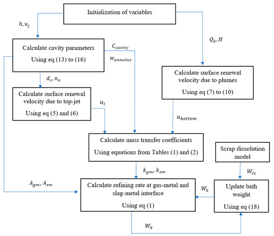 The sequence of calculation for the refining model at the impact and slag-metal bulk zones is represented in Figure 3. For every time step, the data from hot metal and scrap composition such as manganese and silicon, metal-bath height, , lance height, , velocity of the oxygen jet at the impact point and bottom gas flow rate, with time are taken as inputs. The resultant cavity parameters and reaction areas (impact zone and slag-metal bulk) are then evaluated, followed by the calculation of the surface renewal velocities due to the top-jets and bottom-stirring separately as described in the previous section. The mass transfer coefficients at the two zones are calculated using Equation (11) while the refining rate at the two zones is calculated using Equation (1). Subsequently the composition of the bath is updated by taking into account the instantaneous bath weight , melted scrap weight , weight of solute removed and the sequence of calculation is repeated for the next time step.