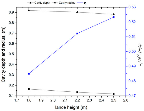 The surface renewal velocities at the impact zone were calculated with respect to time, considering the instantaneous blowing parameters for the operation of Cicutti et al. [4,5]. Figure 4 illustrates the variation of the surface renewal velocity due to the top-jet with respect to cavity dimensions at various lance heights prevalent during the blow. The decrease in lance height decreases the surface renewal velocity and increases the cavity depth and radius. The decrease in lance height would increase the momentum transferred by the oxygen jet to the cavity, which is expected, but this increased momentum supply is consumed in droplet generation and does not translate into an increase in surface renewal rate. This result is consistent with the literature. Hwang and Irons [43] also stated that the kinetic energy transfer (from the jet to the bath) was more efficient at higher lance heights based on their observation. The Energy Transfer Index (ETI) values for higher lance heights were higher than those for lower lance heights. The ETI is defined as a ratio between the kinetic energy of the bath and the input kinetic energy of the jet [43]. Similar observations were made in recent study by Zhou et al. [66] on kinetic energy dissipation by metal bath and slag in oxygen steelmaking vessels. For a 100-t oxygen steelmaking vessel they calculated the ETI value to decrease by 36%, when the lance height was lowered from 1.6 m to 1 m (for O2 flow rate of 3.76 ).