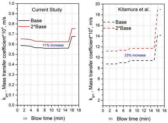 In Figure 6, the predictions of mass transfer coefficients at impact zone, from current study are compared with the values calculated though Kitamura et al.’s [20] approach for Cicutti et al.’s steelmaking operation (wherein the mass transfer coefficient varies as a function of stirring energy imparted on the bath through top-jet and bottom stirring gas). The mass transfer coefficients have been evaluated at two distinct bottom stirring flow rates, namely the base case of 2.5 Nm3/min and 5 Nm3/min. If the bottom stirring rate is doubled, an 11% increase in mass transfer coefficient is observed whereas in Kitamura et al.’s case the increase is 23%. The increase in bottom stirring rate would indeed increase the metal re-circulated per unit time (thus reducing the mixing time) but does not proportionately increase the metal reaching the interface. There is a limit to the metal coming in contact with the interfaces which is discussed in Section 3.3.