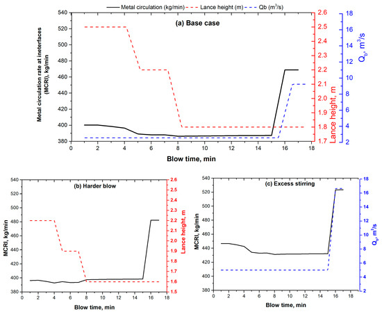 Effect of lance height and stirring rate on metal circulated at cavities and slag-metal bulk. (a) Base case (for operation of Cicutti et al., (b) Harder blow i.e., consistently lower lance height (2.2 m/1.9 m/1.6 m), (c) Excess stirring rate: 5 m3/s (0–15 min), 16.66 m3/s (16–17 min).