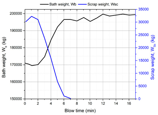 The change in bath and scrap masses for Cicutti et al.’s operation is shown in Figure 8. There is a minor decrease in metal bath weight in the first 2 min of the blow due to the freezing of metal on the surface of cold scrap and a corresponding rise in scrap weight. Subsequently the scrap melts steadily and the bath weight increases linearly. There is a minor change in the bath weight after scrap is fully melted.