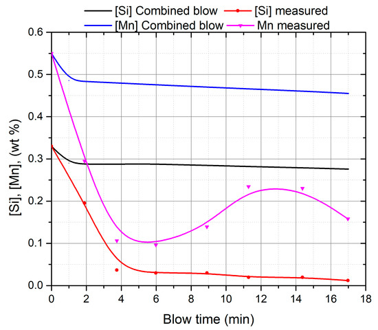 Figure 10 compares the predicted concentration of silicon and manganese in the metal to the measured values reported in the study of Cicutti et al. [4,5]. The calculated values are significantly higher than the measured values due to low refining rates at the impact and slag-metal bulk zones. The value of product of mass transfer coefficient and reaction area () should be 50–100 times higher if the impact and slag-metal bulk zones are considered as major refining zones. This indicates that the contribution of these reaction zones is insignificant. The authors are currently working on the calculation of refining rates in other possible reaction zones. It is still important to identify the possible sources of such a low prediction. It is worth considering how the selection of diffusion coefficient values from literature would affect the refining rate predictions. The lower diffusion coefficient values by Grace and Derge [54] (discussed in Section 2.3) will affect the mass transfer coefficients to an extent, however the mass transfer rates don’t increase significantly and there is no appreciable increase in the refining rates (the predicted final silicon content decreases from 0.2758 wt % to 0.25 wt %.