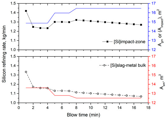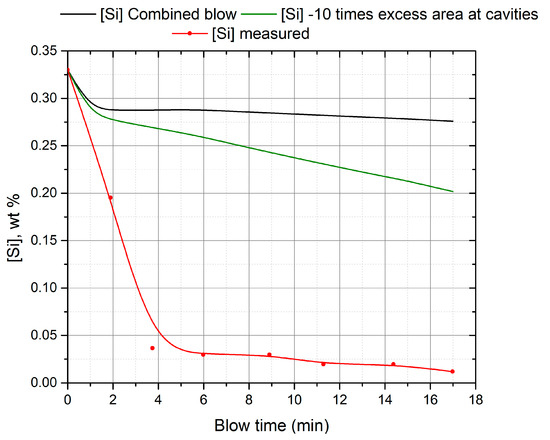 Another possible reason for the low predictions might be a small gas-metal reaction interface which is related to the assumption that the cavity surface is smooth (approximately 15 m2). If the surface area of the impact zone rises by a factor of 10 (by assuming roughness due to splash sheet formation), the corresponding increase in the silicon refining rate is shown in Figure 12. The final silicon content goes down to 0.20 wt % if the surface roughness is considered, but it still cannot explain the rapid oxidation of silicon during the initial part of the blow. It is worth mentioning about the hot-model study by Koch et al. [61]. They conducted experiments which involved the blowing of an oxygen jet on a 50 kg molten Fe-C bath to simulate the top-blown oxygen steelmaking process. The generated droplets due to “metal-bath spraying” at the cavity were sampled at various points of the cross section of the metal sampler during a blow. The authors observed that at any given instant, the droplets had lower carbon content than the metal bath. Further the “inner” droplets (ejected into the jet) experienced much higher decarburization as compared to the “outer” droplets (ejected away from jet). This indicates a possibility of significant contribution of decarburization and other refining reactions via the gas-metal droplet interface rather than the smooth cavity surfaces.