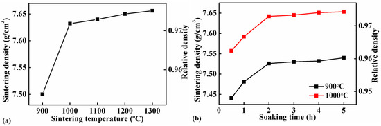 Sintering densities of Fe-0.8%P samples sintered at different temperatures for 2 h (a), and those sintered at 900 °C and 1000 °C for different periods of time (b).
