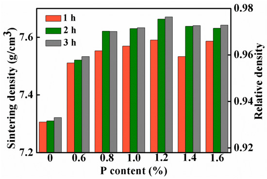 3.1. Effects of Sintering Parameters and P Contents on the Sintering Density